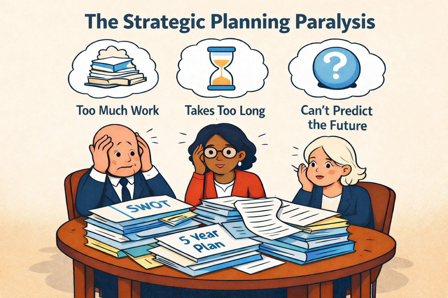 Nonprofit executive directors and board chairs know this moment all too well: Your board needs direction — badly — but the idea of launching a full-blown strategic planning process makes you want to fake a Wi-Fi outage. Consultant/facilitator fees. The months of meetings. The endless SWOTs that somehow say everything and nothing at the same time. All of it piled on top of an organization that’s already running lean and trying to actually do work. So here’s the question no one asks out loud: What if the problem is not that you don’t have a plan — it’s that planning has become the work?